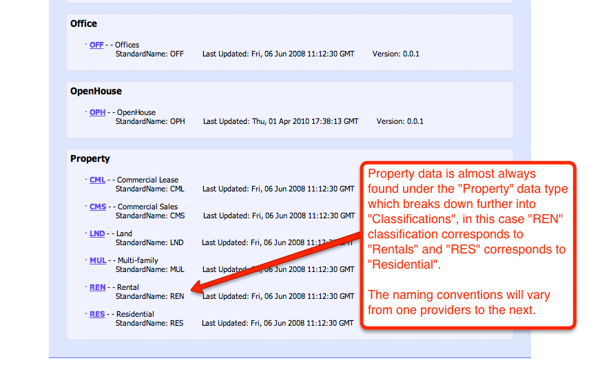 - Property data is almost always found under the “Property” data type which breaks down further into “Classifications”, in this case “REN” classification corresponds to “Rentals” and “RES” corresponds to “Residential”. The naming conventions will vary from one providers to the next.